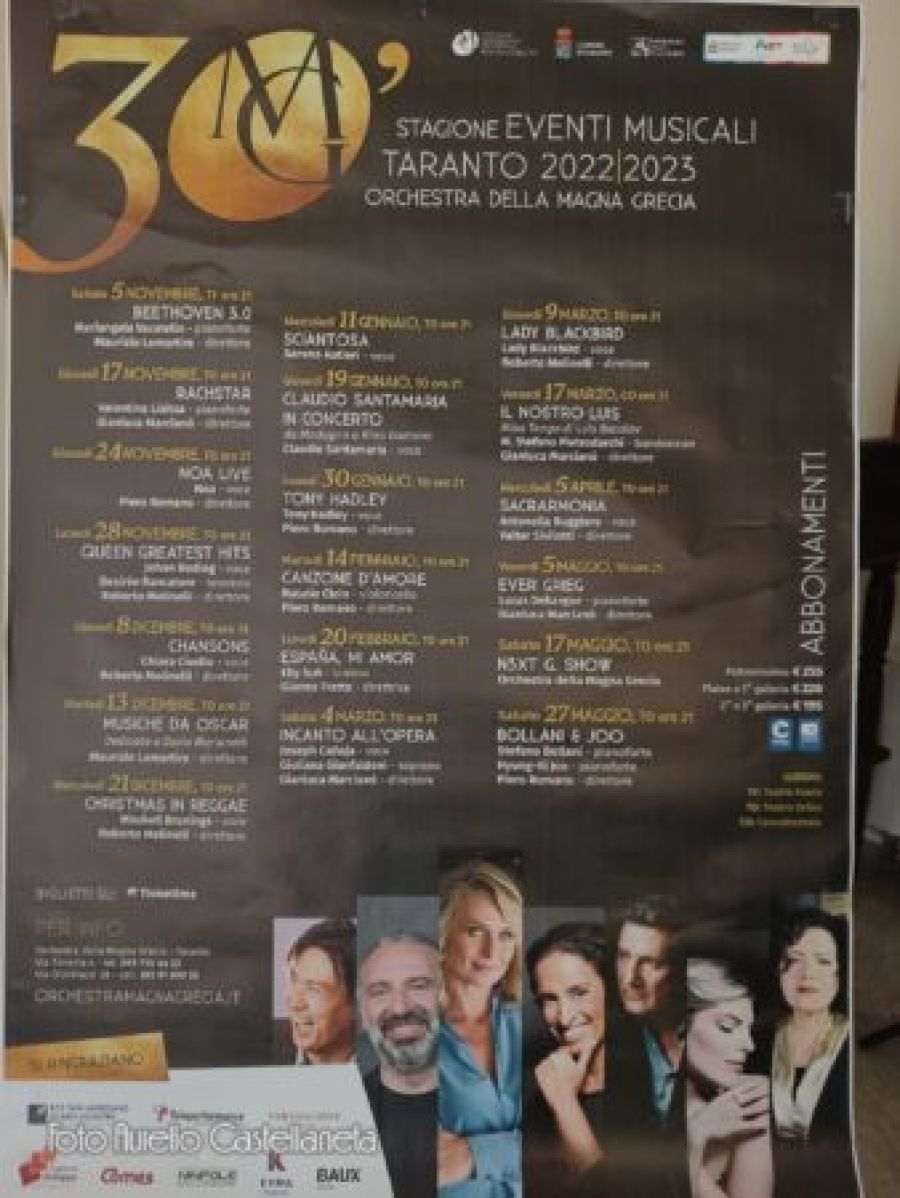 Informazioni Orchestra Magna Grecia, sede via Ciro Giovinazzi 28 a Taranto (3929199935). Sito: orchestramagnagrecia.it Sarà possibile abbonarsi con il diritto di prelazione sino al 19 ottobre presso la sede dell’Orchestra in via Ciro Giovinazzi 28 Taranto. La prevendita dei biglietti singoli inizierà a partire dal 24 ottobre 2022