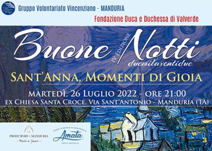 “Dal 2015 il Volontariato Vincenziano di Manduria organizza le “BuoneNotti” in location suggestive, eventi benefici che vanno dritti al cuore – si legge nella nota stampa – con l’obiettivo di finanziare progetti di solidarietà che riguardano il contrasto alle povertà morali e materiali, cercando soprattutto di combattere le cause che le determinano, favorendo la promozione umana delle persone e adattando le modalità di intervento ai cambiamenti sociali e culturali. Grazie alla collaborazione con la Fondazione “Duca e Duchessa di Valverde”, quest’anno l’evento sosterrà progetti a favore degli “Anni d’argento” per il contrasto alle fragilità e alle solitudini della terza età. La Fondazione “Duca e Duchessa di Valverde”, infatti, opera da oltre un decennio nella provincia di Taranto con l’obiettivo di aiutare le persone fragili e malate, con una attenzione particolare alle persone anziane, cercando di intervenire in modo efficace, e allo stesso tempo discreto”.