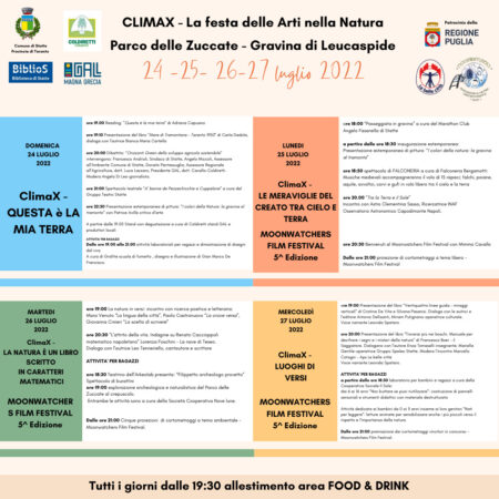 Il programa si sviluppa su quattro serate: 24 – 25 – 26 e 27 luglio, dalle 19 alle 23 “Torna Climax, il luogo dove arti e natura incrociano le storie da conoscere, il presente da analizzare e il futuro da rendere sostenibile – si legge nella nota stampa – quattro giornate dedicate alle buone pratiche ambientali, come escursioni naturalistiche e laboratori archeologici, alla promozione di prodotti agricoli a km0, alla presentazione di modelli di sviluppo economico e di produzione sostenibili, alle varie espressioni artistiche e culturali che animeranno le serate: dal teatro alla musica, passando per pittura, fotografia, editoria e cinema. Con la partecipazione di ospiti di rilievo, Climax si propone come luogo di condivisione, riflessione e approfondimento immerso nella Natura. E’ infatti un’iniziativa culturale, volta alla valorizzazione e al recupero del patrimonio paesaggistico e ambientale del Comune di Statte” aggiungono gli organizzatori . “L’obiettivo è duplice – dichiara Debora Artuso, presidente del Consiglio comunale di Statte e delegata alla Cultura – da un lato di far conoscere le peculiarità storiche e paesaggistiche del territorio, frutto di un antichissimo processo di antropizzazione: un’inedita bellezza sconosciuta ai più. Dall’altro lato, promuovere nuovi paradigmi di sviluppo sostenibile e diffondere elementi di educazione ambientale”.