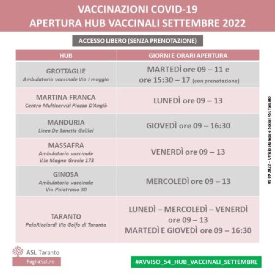 Per quel che riguarda le aperture: a Taranto, l’hub al Palaricciardi sarà operativo dal lunedì al venerdi dalle 9 ore 9 alle ore 13 e, per agevolare le vaccinazioni pediatriche, il martedì e il venerdì fino alle 16:30; l’hub vaccinale di Grottaglie in via I maggio è operativo il martedì dalle ore 9 alle ore 11 – ad accesso libero – e dalle ore 15.30 alle ore 17 esclusivamente su prenotazione. A Martina Franca, al Centro Multiservizi in Piazza D’Angiò, apertura il lunedì dalle 9 alle 13; l’hub di Ginosa, al Centro vaccinale Asl in Via Palatrasio 30, è operativo il mercoledì dalle 9 alle 13; a Manduria, l’hub presso il Liceo De Sanctis, operativo giovedì dalle 9 alle 16:30; il centro vaccinale di Massafra, presso l’ambulatorio vaccinale in Viale Magna Grecia 173, accessibile venerdì dalle 9 alle 13.