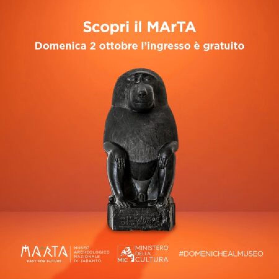 Tra questi figura anche la statua in basalto del dio egizio della scrittura Thot che è il reperto testimonial scelto dal Museo Archeologico Nazionale di Taranto, per ricordare la gratuità dell’ingresso al MArTA nella prima domenica del mese.