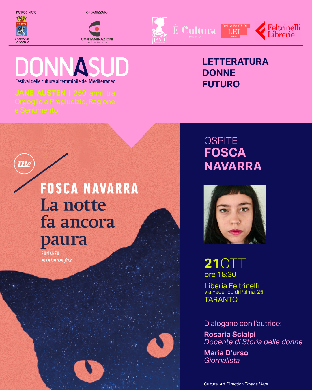 Maretedì 21 ottobre, nella Libreria Feltrinelli di Taranto, Fosca Navarra presenterà il suo romanzo La notte fa ancora paura (ed. Minimum Fax). Inizio ore 18:30. Dialogano con l’autrice la giornalista Maria D’Urso e la docente Rosaria Scialpi. L’edizione 2025 del Festival è dedicata a Jane Austen, in occasione del 250° anniversario della sua nascita.