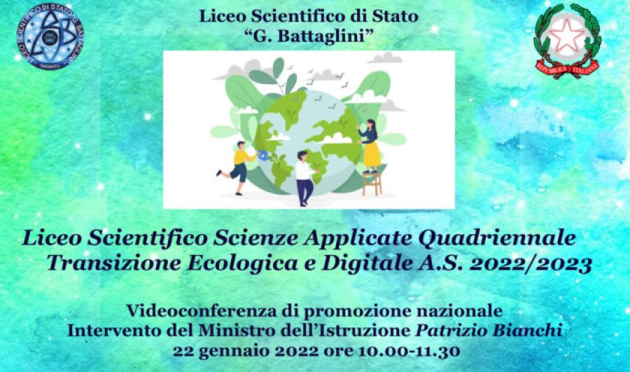 Sabato 22 gennaio 2022, dalle ore 10 alle 11.30, il liceo Scientifico “G. Battaglini” di Taranto parteciperà all’incontro in videoconferenza di promozione nazionale del Liceo scientifico quadriennale delle Scienze Applicate per la Transizione Ecologica e Digitale, che arricchirà l’Offerta Formativa dell’ Istituzione scolastica a partire dall’A.S. 2022/2023.