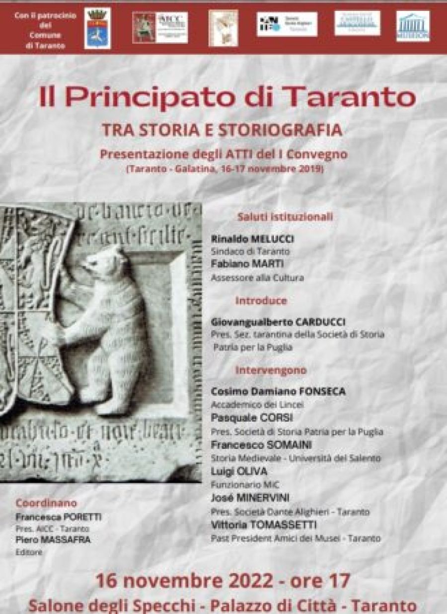 Mercoledì 16 novembre 2022, alle ore 17, nel Salone degli Specchi a Palazzo di Città, sarà presentato il volume degli ATTI del I Convegno sul Principato di Taranto, tenutosi a Taranto e Galatina (Lecce) nei giorni 16 e 17 novembre 2019.