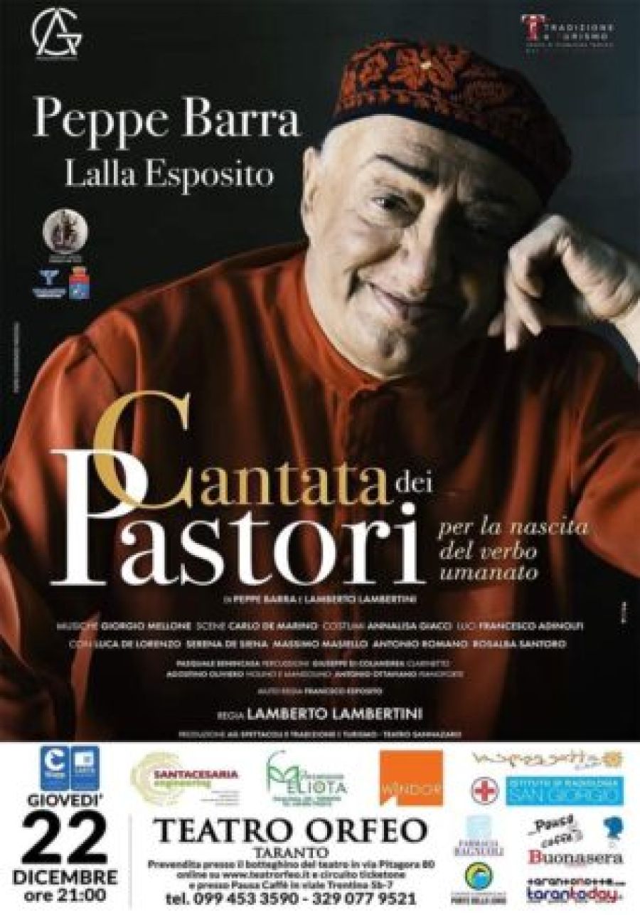 Il Teatro Orfeo di Taranto ospiterà Peppe Barra e Lalla Esposito con “Cantata dei pastori”, giovedì 22dicembre alle ore 21. Immaginate due napoletani, due morti di fame, Razzullo, scrivano in abiti settecenteschi, capitato in Palestina per il censimento voluto dall’Imperatore Romano, e Sarchiapone, suo compaesano, in fuga per i crimini commessi, mentre Giuseppe e la Vergine Maria vagano in cerca di alloggio per far nascere Gesù. Immaginate una tribù di Pastori in attesa del Messia. Immaginate una turba di Diavoli, mandati da Lucifero sulla terra per uccidere la Sacra Coppia, spaventare e torturare in tutti i modi i due disgraziati compagni, che le provano tutte pur di trovare un lavoro che permetta loro di mangiare. Immaginate l’Arcangelo Gabriele, armato come un San Michele, proteggere tutti, ricacciare le Furie nel buio dell’Inferno e permettere che nasca il Redentore. Immaginate.