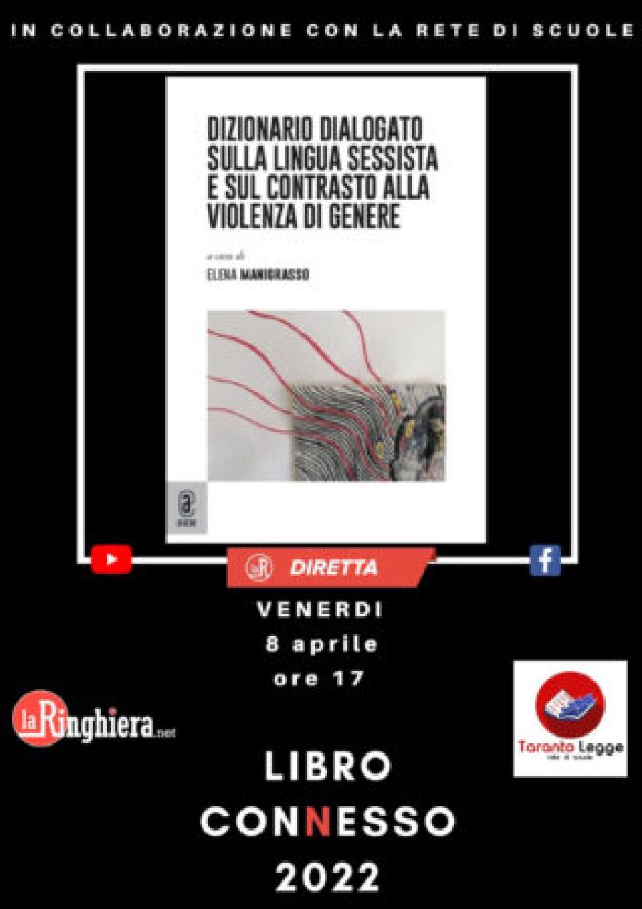 In collaborazione, come sempre, con la Rete di Scuole Taranto Legge (Archita, Aristosseno, Calò, Ferraris/Quinto Ennio, Liside, Maria Pia e Pitagora) il programma prevede il dibattito on line con Elena Manigrasso ed il suo Dizionario dialogato sulla lingua sessista e sul contrasto alla violenza di genere (leggi qui).