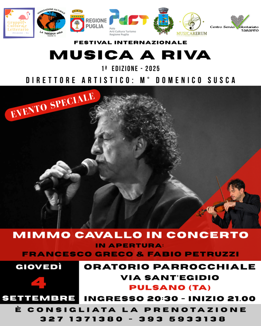 Il viaggio musicale di Musica a Riva giunge alla sua decima e ultima tappa con il concerto del cantautore pugliese Mimmo Cavallo. L’appuntamento è per giovedì 4 settembre 2025 nell’Oratorio Parrocchiale in via Sant’Egidio a Pulsano (Taranto).