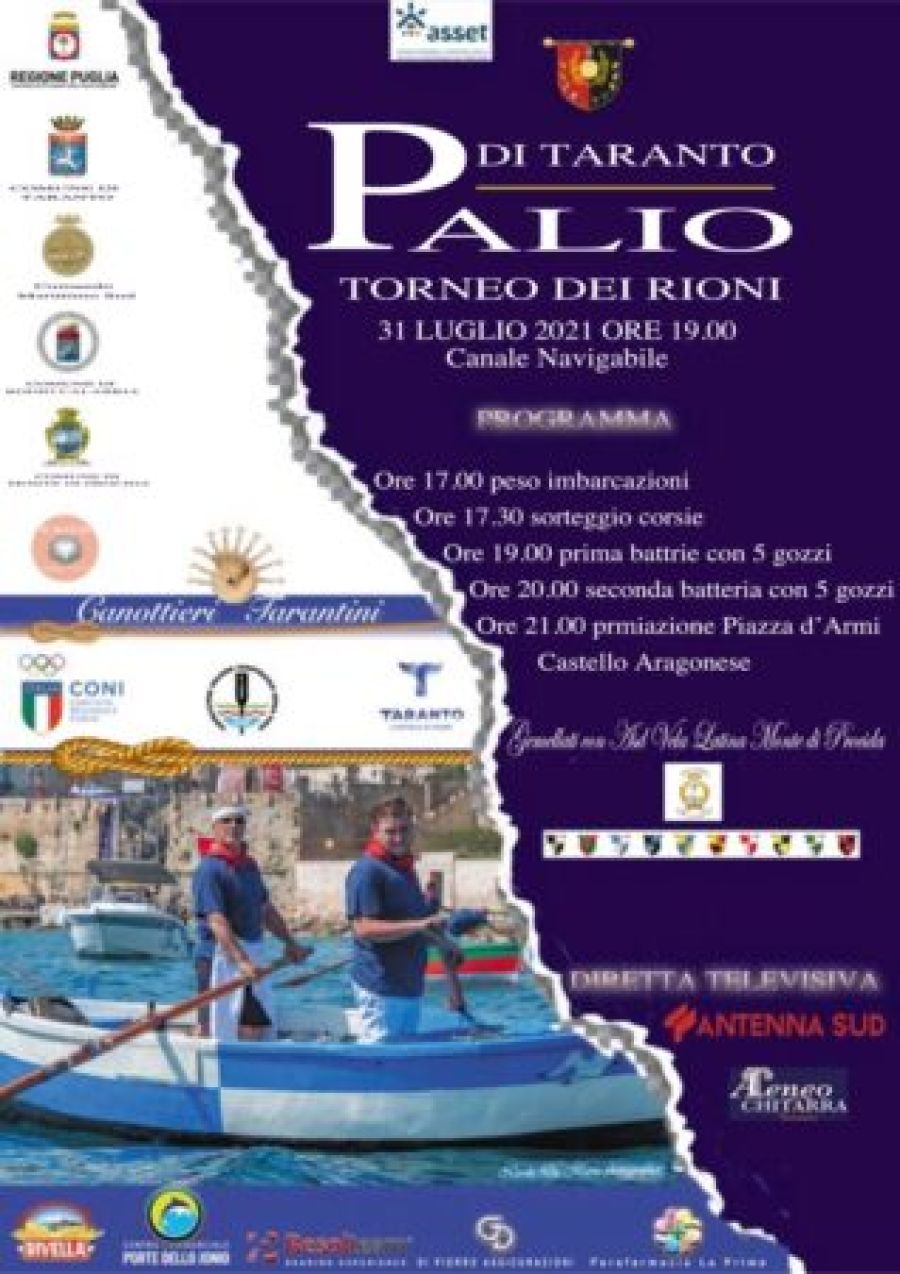 Al via sabato 31 luglio, i momenti conclusivi dell’edizione numero 36 del Palio di Taranto. La storica regata in barche a remi, ognuna rappresentante i dieci rioni cittadini, come detto era cominciata lo scorso 3 luglio… quando nelle acque del Canale Navigabile i suggestivi gozzi in legno avevano duellato per la conquista della prima manche.