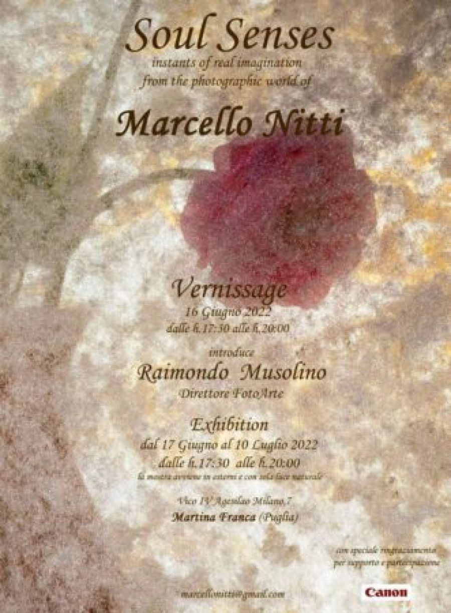 Si intitola Soul Senses, sensazioni dell’animo, la mostra fotografica di Marcello Nitti, volto noto della Taranto musicale, fotografo di spiccata sensibilità. La mostra si svolgerà a Martina Franca, nei vicoli del centro storico, in via Agesilao Milano, 13. Il vernissage è in programma giovedì 16 giugno, alle ore 17.30, l’introduzione è affidata a Raimondo Musolino, direttore di FotoArte, allestimento a cura di Print Me. La mostra resterà aperta fino al 10 luglio dalle 17.30 alle 20.