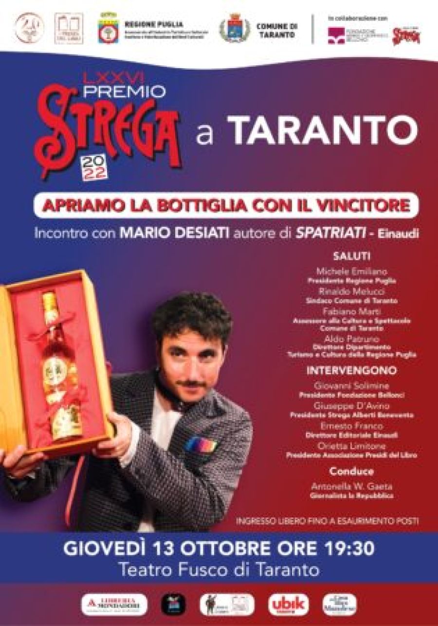 La cerimonia si svolgerà il 13 ottobre, alle 19:30, nel corso di una serata organizzata dall’associazione Presìdi del libro e dal Comune di Taranto, con il sostegno della Regione Puglia e la collaborazione di Fondazione Bellonci e Strega Alberti Benevento. Dopo i saluti dei rappresentanti del Comune di Taranto e della Regione Puglia, interverranno Ernesto Franco, direttore editoriale di Einaudi, Giovanni Solimine, presidente della Fondazione Bellonci, e Orietta Limitone, presidente dell’Associazione Presìdi del libro.