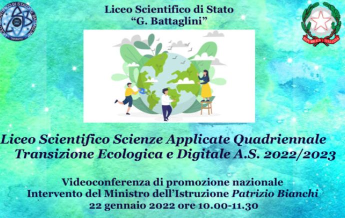 Sabato 22 gennaio 2022, dalle ore 10 alle 11.30, il liceo Scientifico “G. Battaglini” di Taranto parteciperà all’incontro in videoconferenza di promozione nazionale del Liceo scientifico quadriennale delle Scienze Applicate per la Transizione Ecologica e Digitale, che arricchirà l’Offerta Formativa dell’ Istituzione scolastica a partire dall’A.S. 2022/2023.