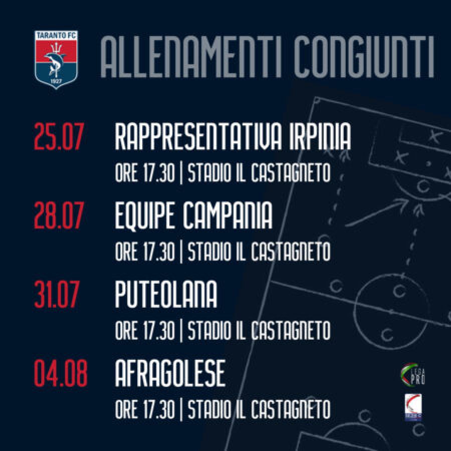 Ecco date e squadre degli ‘allenamenti congiunti’, di fatto amichevoli pre campionato, che il Taranto Football Club 1927 svolgerà durante il periodo di ritiro pre campionato (grafica Taranto Fc).