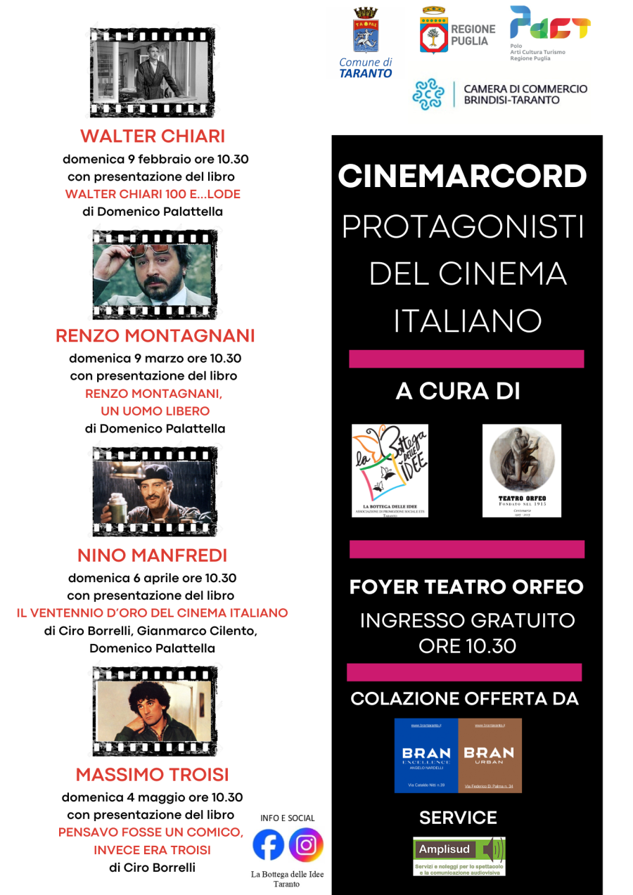 Un viaggio nell’universo filmico, nella finzione cinematografica e nei suoi linguaggi ammalianti che permetterà di avviare delle “Conversazioni sul cinema italiano”. Quattro gli appuntamenti, di domenica mattina nel foyer del Teatro Orfeo di Taranto, dedicati al ricordo di alcuni dei protagonisti della commedia italiana.