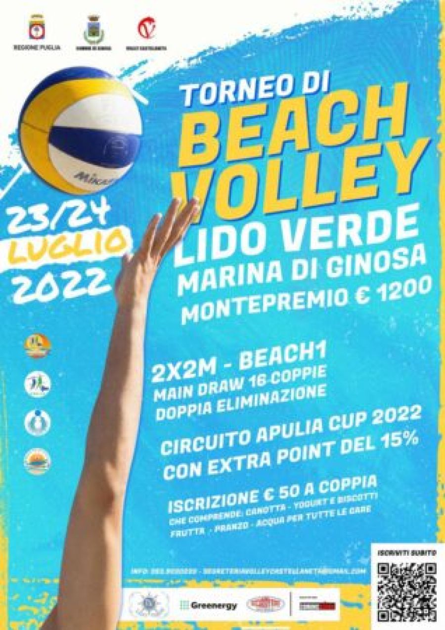 Tutto pronto per il Torneo di Beach Volley che si terrà il 23 e 24 luglio a Marina di Ginosa, presso il Lido Verde. Un evento sportivo organizzato dall’Associazione Sportiva Dilettantistica Ginosa 2019, in collaborazione con la Società Sportiva Dilettantistica Volley Castellaneta e con il patrocinio del Comune di Ginosa e della Regione Puglia, rientrante nel cartellone degli eventi estivi 2022 “Riempiamo gli Spazi’’.