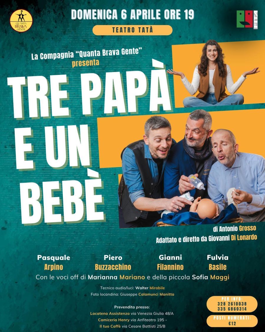 La Compagnia “Quanta brava gente” torna in scena con una nuova commedia, capace di divertire e proporre al contempo riflessioni su temi delicati e rilevanti della società contemporanea. L’appuntamento con “Tre papa e un bebè” è per domenica 6 aprile, alle 18.30 (sipario ore 19), al teatro TATà, in via Deledda, a Taranto. La pièce teatrale, scritta da Antonio Grosso, adattata e diretta da Giovanni Di Lonardo, ha per protagonisti tre uomini che condividono lo stesso tetto. Sono professionisti in vari settori che dopo l’università hanno deciso di vivere insieme per combattere il caro vita, ma anche e soprattutto per il legame che li unisce.