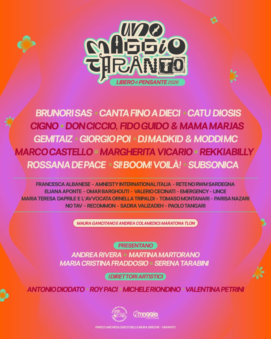 La musica sarà protagonista con gli artisti che hanno scelto il palco di Taranto, con una line-up che attraversa generazioni e linguaggi molteplici: anche Subsonica e Brunori Sas, oltre ai già annunciati Gemitaiz, Giorgio Poi, Margherita Vicario, Marco Castello. E ancora il collettivo Canta Fino a Dieci, progetto che mette al centro scrittura e dimensione condivisa; Rossana De Pace, voce intensa della nuova canzone d’autore; Catu Diosis, producer, DJ e rapper originaria di Kampala (Uganda); Cigno, progetto dal grande impatto sonoro che parla di capitalismo, disuguaglianze e guerra; il dj e producer Madkid, noto nella scena black italiana per il suo stile eclettico, affiancato sul palco da Moddi, MC, campione di freestyle e membro del collettivo musicale Pooglia Tribe; i SI!BOOM!VOILÁ, collettivo della scena alternativa italiana formato da N.A.I.P, Giulio Ragno Favero, Roberta Sammarelli, Giulia Formica e Davide La Sala, che unisce elettronica, noise e performance dal vivo; Don Ciccio, DJ e producer attivo nella scena reggae e hip hop italiana dagli anni ’90, fondatore dell’etichetta Love University Records; Fido Guido, cantautore pugliese legato al reggae/dancehall e alla lingua dialettale tarantina; Mama Marjas, tra le principali voci italiane del reggae e delle sonorità afro-caraibiche e i Rekkiabilly. Una costellazione di progetti che riflettono la varietà della scena contemporanea.