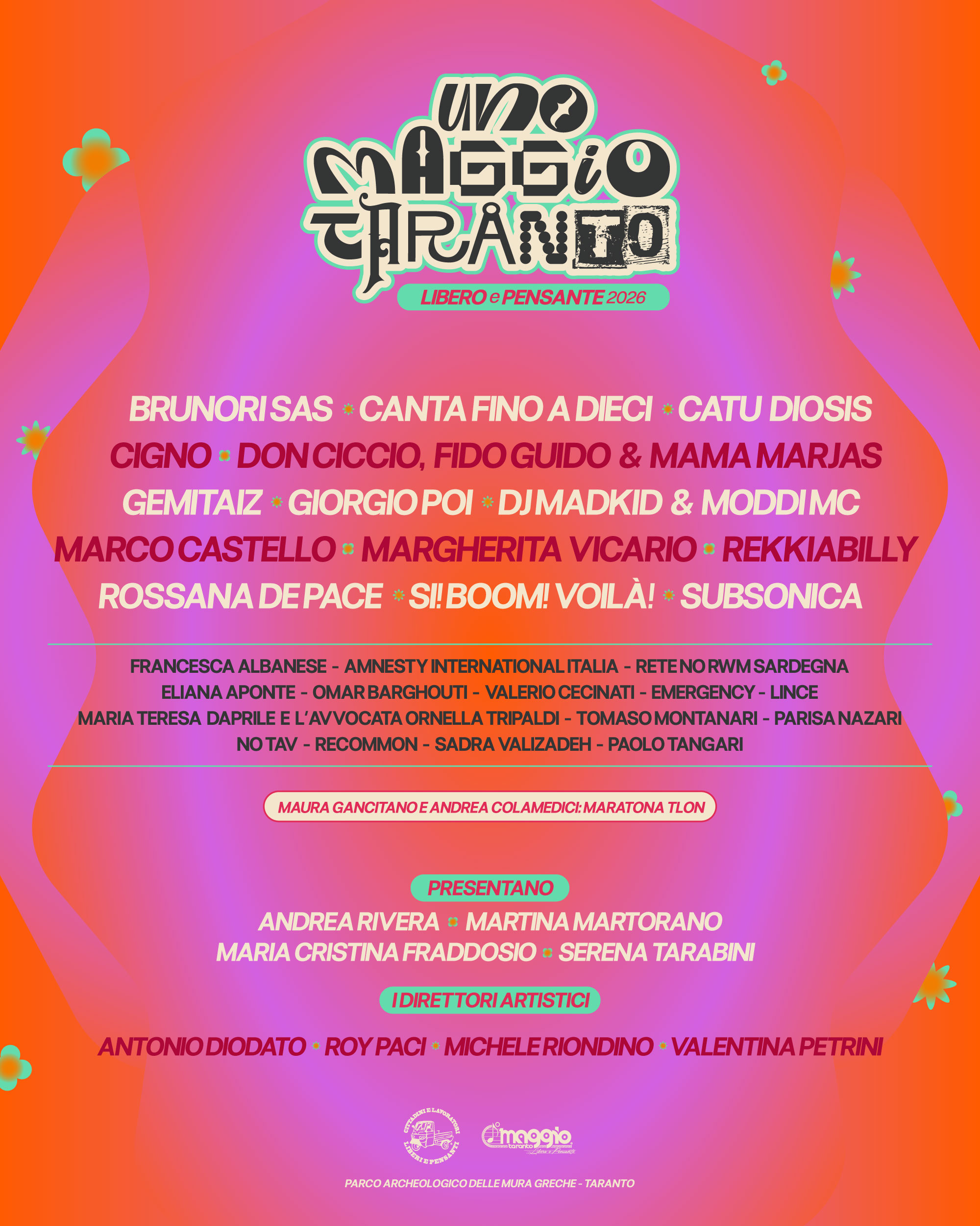 Non mancheranno contenuti sul tragico rapporto tra inquinamento e salute grazie all’intervento del dottor Valerio Cecinati, fondatore del reparto di Oncoematologia Pediatrica al SS. Annunziata di Taranto. Infine sul palco di Uno Maggio Taranto 2026 anche la voce dell’attivista Lince con la Campagna “Lince-Occhi sugli abusi” con il manifesto di Zerocalcare. Alla conduzione, come ormai da tradizione, Andrea Rivera, che ha contribuito dall’inizio con la sua inconfondibile nota satirica; Martina Martorano, anche lei attiva per la causa da molte edizioni, conduttrice di SAFARI su Rai Radio2 e consulente musicale di Propaganda Live, ormai colonna portante della conduzione della manifestazione e la giornalista Serena Tarabini, anche lei attiva da anni su Uno Maggio Taranto, dando un contributo che è molto più di una semplice conduzione. Quest’anno si aggiunge anche la giornalista Maria Cristina Fraddosio alla cura di alcuni dei più importanti interventi politici in scaletta. Per la prima volta a Taranto la visione dei filosofi Maura Gancitano e Andrea Colamedici, fondatori di Tlon, che realizzeranno una maratona sui loro canali social per raccontare a tutta Italia l’edizione 2026 anche attraverso interviste esclusive dal backstage per Uno Maggio Taranto.
